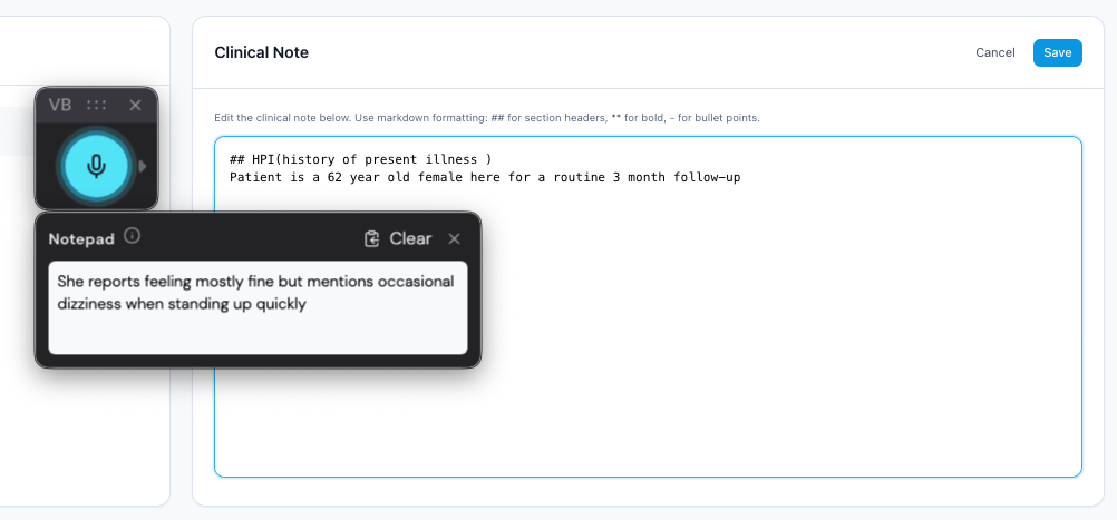VoiceboxMD includes a structured Clinical Note editor that provides a formatted workspace for building complete patient documentation. Simply Say “Format”, The editor supports markdown formatting: use ## for section headers, ** for bold text, and  for bullet points.