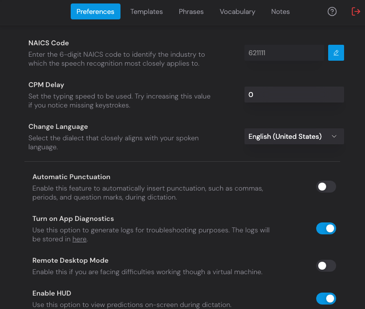 Set the 6-digit industry code (default 621111 for physician offices) so the speech engine prioritizes medical vocabulary relevant to your specialty.