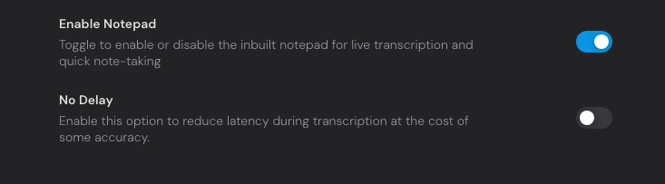 Turns on the floating Notepad that shows your transcription in real time. Useful for reviewing what was captured before inserting it into a text field.