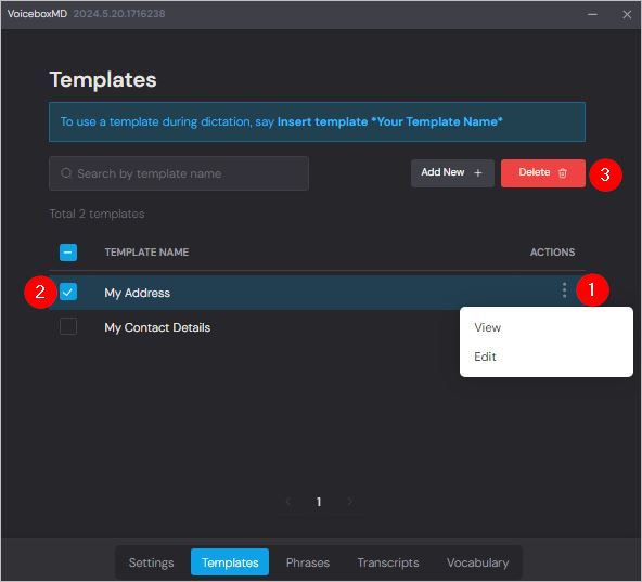 To edit a template, click on the three dots in the ACTIONS column (1) and select Edit. To delete a template, select one or more templates (2) and then click Delete (3).