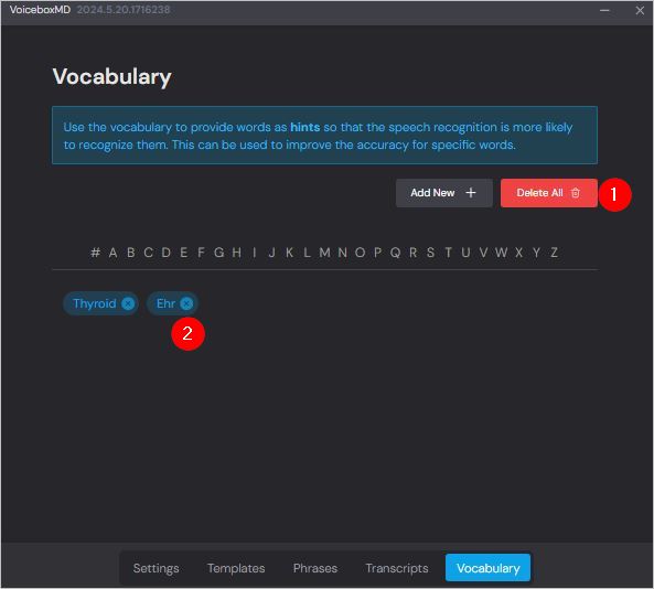 To delete all the custom words you may have added to VoiceboxMD’s dictionary, click Delete All (1).