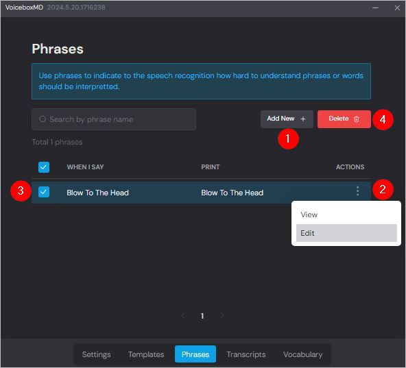 To edit a phrase, click on the three dots in the ACTIONS column (2) and select Edit.. To delete a phrase, select one or more phrases (3) and then click Delete (4).