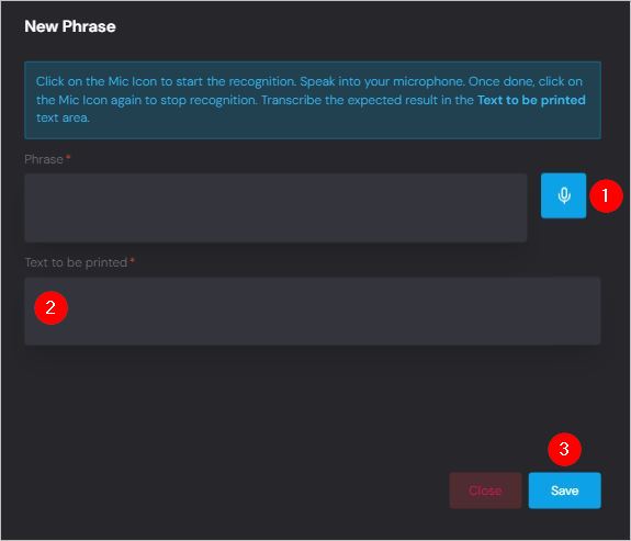 Click on the microphone icon (1) to start the audio listener. Speak into your microphone. Once done, click on the microphone icon again to stop voice recognition. Type the expected result in the Text to be printed box (2). Click Save (3).