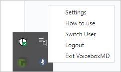 You can perform VoiceboxMD configurations by right-clicking on the VoiceboxMD icon in the Windows system tray and selecting Settings.