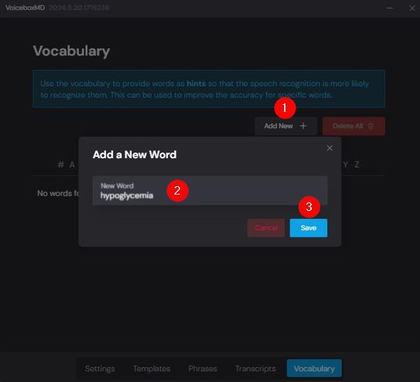 You can add new words to VoiceboxMD’s built-in dictionary on the Vocabulary tab in the Control Panel. To add a new word that VoiceboxMD will recognize and spell correctly when you use it, click on the Add New + button (1), enter the word you wish to save (2) and then click Save (3).