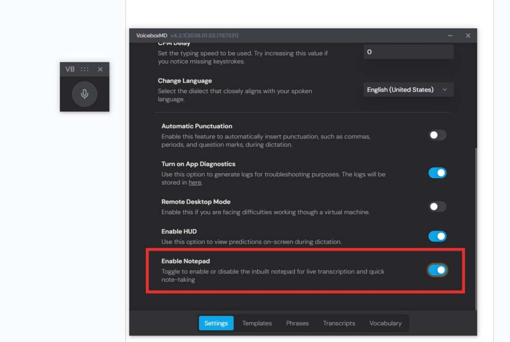Note: If the VoiceboxMD Notepad does not appear when you start dictation, it may be disabled in your settings.