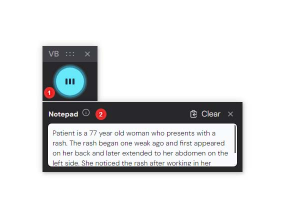 Before starting a new note in your EHR, you need to click the mic icon to start dictation (1), then start speaking. Your dictation will first appear in the VoiceboxMD Notepad (2).